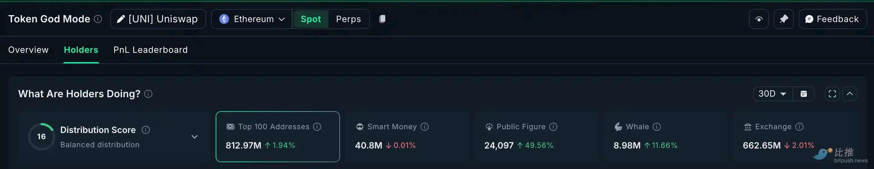 ● UNI:过去一周巨鲸新增约80万枚(价值近$500万美元),费用开关投票通过后,排名前100的地址共持有898万枚UNI,显示出强劲的吸筹势头,而交易平台的供应量却在持续减少。