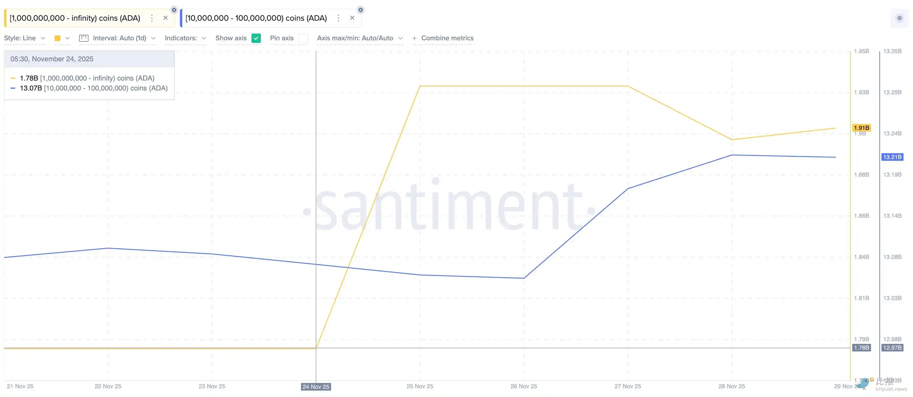 ● 持有量在1000万至1亿枚之间的钱包则于11月26日开始增持,增持量为1.5亿枚ADA;