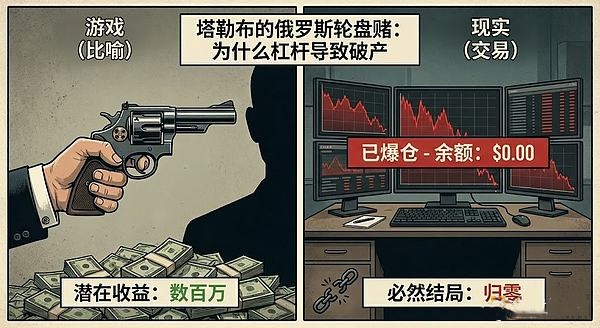 回到币圈合约。很多人开高倍杠杆,追求短期暴利。这就像那个转动左轮手枪的人。你可能连赢9次(枪里没子弹),账户翻了十几倍,觉得自己是股神,策略完美。但这只是幸存者偏差,你只是还没转到那颗子弹。