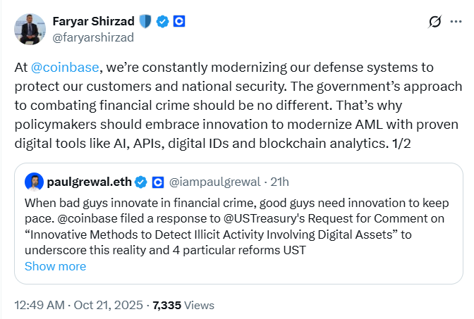 Coinbase首席政策官法亚尔·希尔扎德支持格雷瓦尔的观点,表示公司持续升级系统以保护客户和国家安全,政府也应通过AI、API、数字身份和区块链追踪等成熟数字工具实现同等效能。