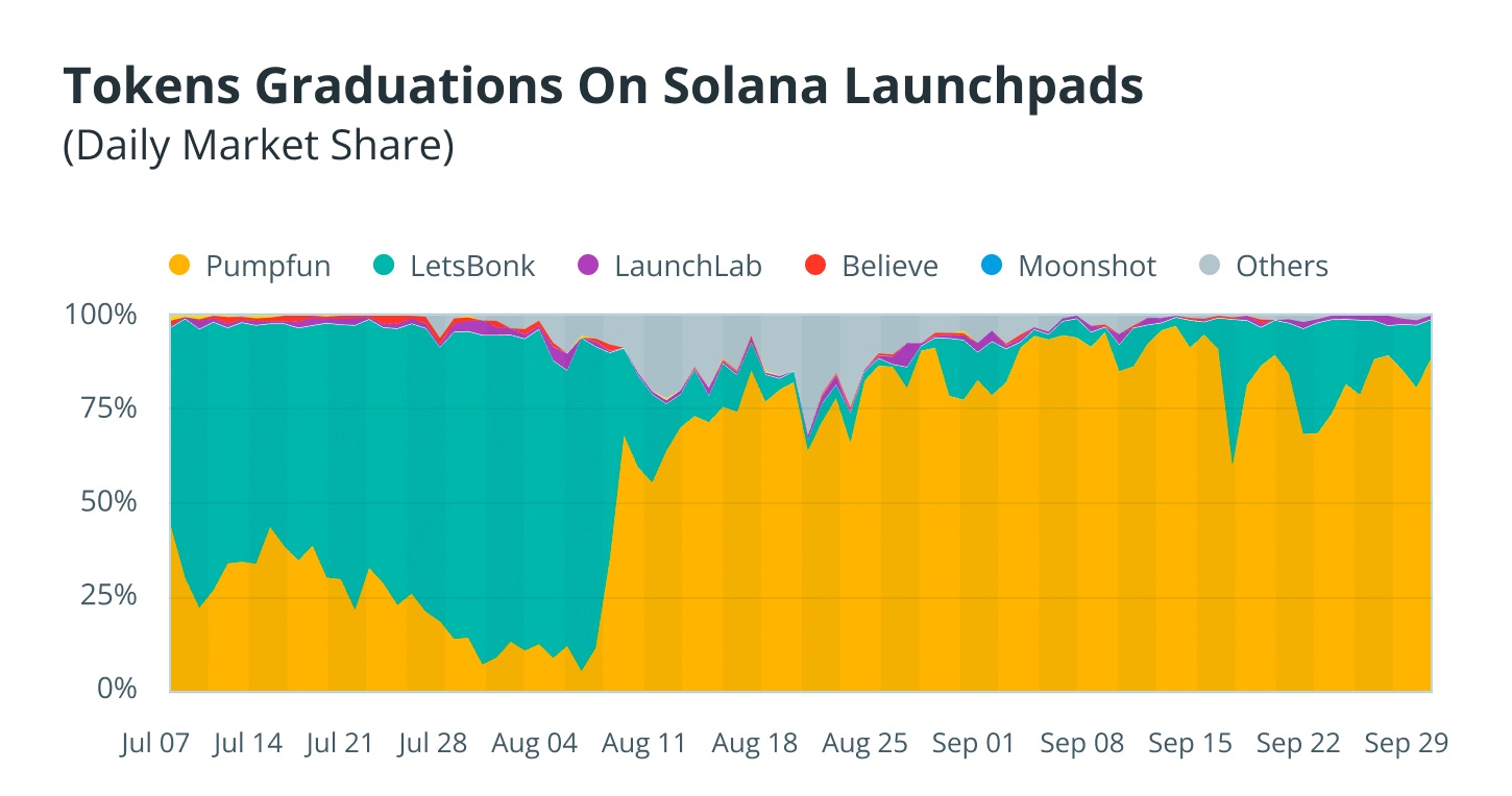 整个2025年,外部追踪器始终显示Pump.fun在市场上涨期间持有约75%-80%的"毕业"Solana启动平台代币份额——这是它在7月下跌后于8月重新达到的水平。