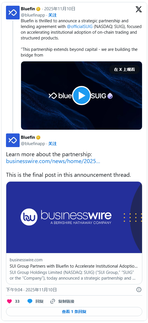 11月10日,Sui区块链生态的财务管理机构——SUI集团正式宣布与去中心化交易所Bluefin达成战略合作,引发市场关注。此次合作被视为Sui生态迈向更高流动性和金融可持续性的关键一步。Bluefin作为Sui链上增长最快的DeFi平台之一,将为SUI生态带来更高的交易效率与流动性支持,而SUI集团的加入则意味着生态基金和协议激励机制将更加完善,或将推动Sui在DeFi赛道中迎来新一轮扩张。