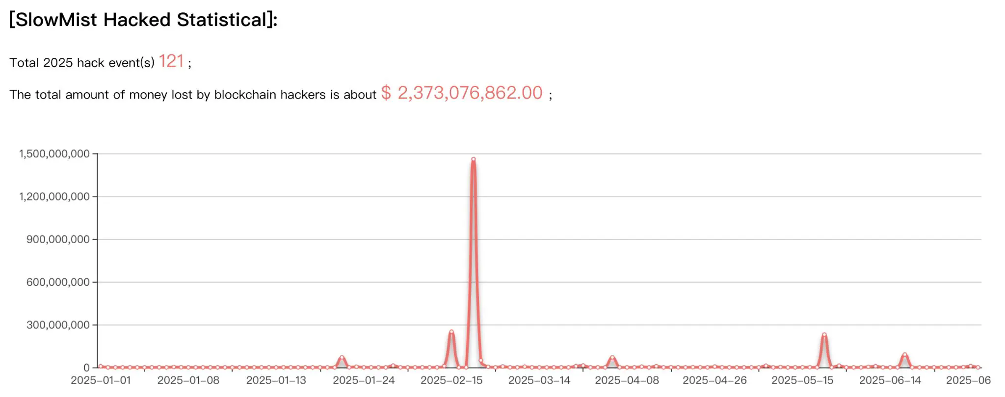 今年的加密攻击呈现出一种新的对称性:事件数量减少,但每次攻击的破坏性却显著增强。SlowMist发布的2025年中报告显示,上半年加密行业遭遇了121起安全事件——比去年同期的223起下降了45%。这本应是好消息,但攻击事件损失却从14.3亿美元飙升至约23.7亿美元,增幅66%。