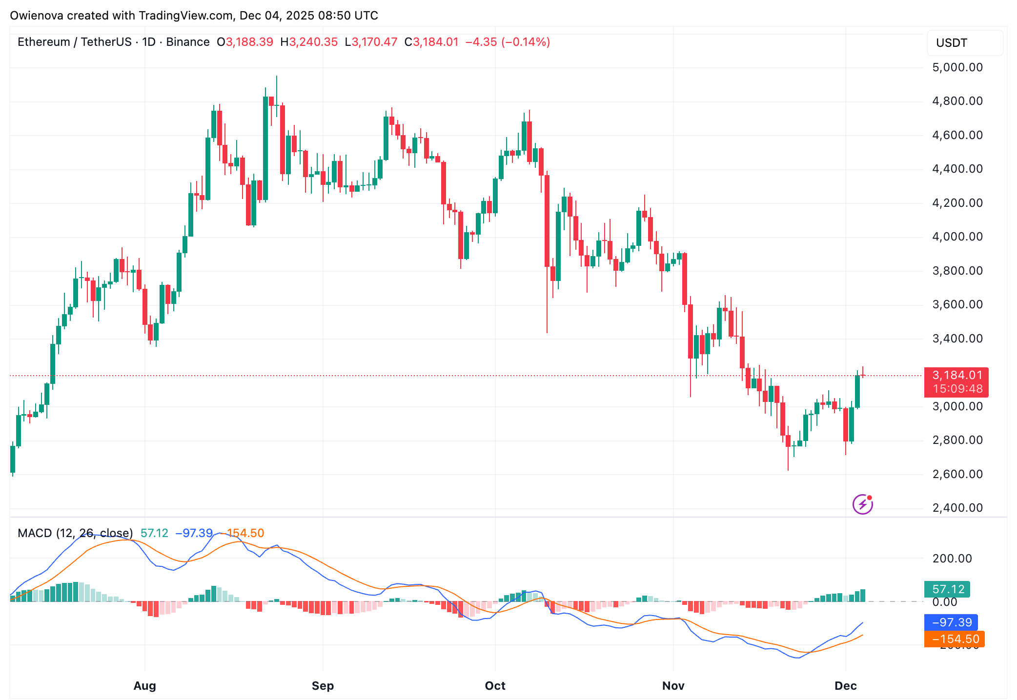 ETH日线图显示价格为3,184美元|数据来源:Tradingview.com上的ETHUSDT