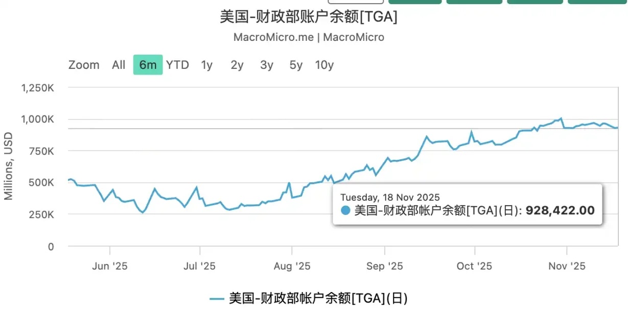 数据显示,从2025年10月1日至11月12日这43天期间,TGA余额持续累积,到11月14日达到9590亿美元的高点。这个水平远高于财政部通常维持的现金部位,主要是因为政府停摆期间支出受限,加上持续发债筹资,导致现金大量累积在国库账户中。