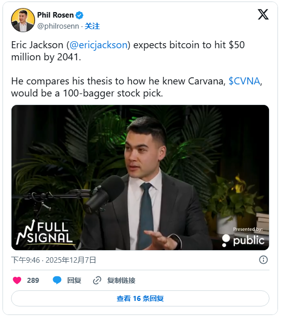 在比特币持续在9万美元上下震荡、市场情绪犹豫不决的时刻,来自EMJ Capital的执行长Eric Jackson却抛出迄今最激进的超级牛市预期:他认为比特币在2041年有望突破5000万美元/枚,从当前价格算起涨幅接近500倍。这一预测并非空穴来风,而是基于机构大量持仓、减半周期叠加供给缩减、全球资金寻找“数字黄金”避险窗口等趋势。