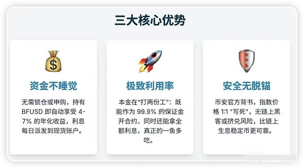 因此,从资产配置视角来看,BFUSD在资金管理策略中可以承担三大关键职责:它能作为防御层,在高波动区间稳定组合风险;它是流动性储备,随时调配用于抓取套利或趋势机会;同时它也是重要的收益缓冲,通过保本理财提供额外收益,有效提升整体投资回报率。它赋予了交易者一种全新的资金管理哲学:“持有、开仓、借贷、拿收益”四不耽误。