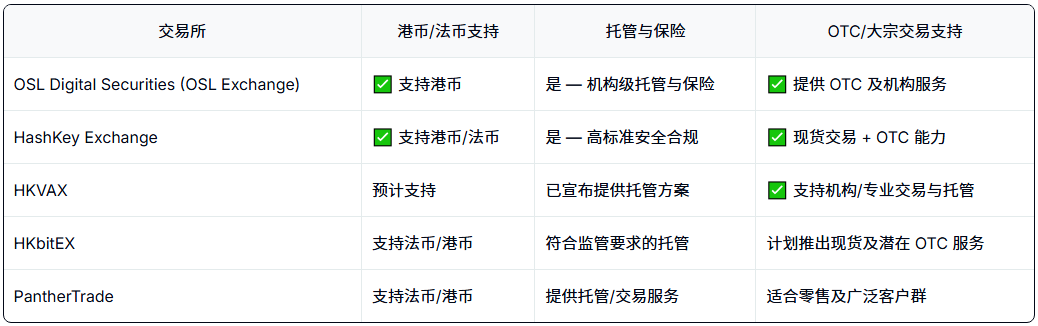持牌中心化交易所(VATPs): 经 SFC 批准向公众提供服务。这是零售和机构投资者最安全、合规的渠道。代表平台如 OSL 和 HashKey Exchange。