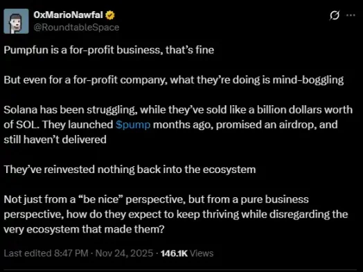 但持续且大额的回购并没有让 pump.fun 的币价有任何起色,甚至仍在不断走低。pump.fun 及其联创 alon 的行为,也越发让市场不满。前天,X 粉丝量超过 260 万的大 V Mario Nawfal 在其小号对 pump.fun 公开进行了抨击: