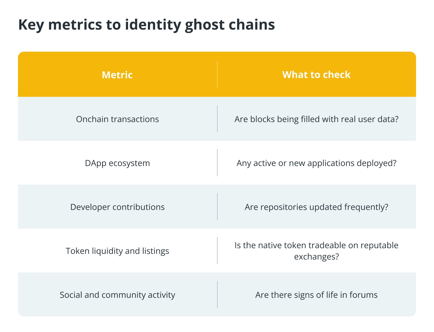 ● 投资者和开发者可以通过监控链上活动、GitHub提交、代币流动性和社区健康状况来避免幽灵链。