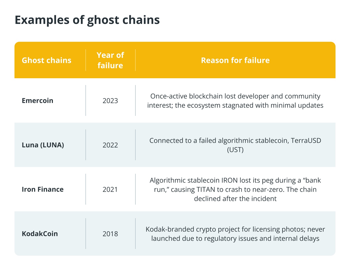 一些曾因创新而受到赞誉的区块链项目,由于使用和可见性下降,已成为幽灵链的例子: