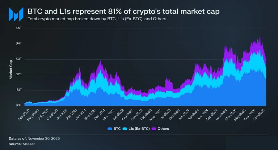 将讨论重新聚焦在“加密货币”本身十分重要,因为加密行业中的大多数资本,最终都是在寻求对“货币化资产”的敞口。目前加密市场总市值为3.26万亿美元,其中BTC占1.80万亿美元,占比55%。在剩余的1.45万亿美元里,大约0.83万亿美元集中在各类L1公链。也就是说,约2.63万亿美元、约占整个市场81%的资金,都投入了市场已经视为货币或认为未来可能获得货币溢价的资产。