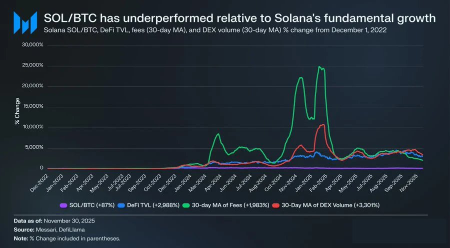 但深入拆解后会发现,SOL的“跑赢”可能并不如表面那么强。在SOL跑赢BTC 87%的同一时期,Solana生态的基本面呈现指数级爆发:DeFi TVL增长2,988%,手续费增长1,983%,DEX交易量增长3,301%。按任何合理标准计算,Solana自2022年底以来的生态规模扩大了20至30倍,但与之对应的SOL价格仅跑赢BTC 87%。