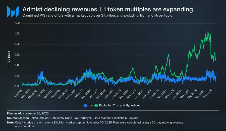 倘若从REV的角度解读,或许可以认为市场在定价未来的收入增长。然而这一解释并不成立,因为在同一组(仍然排除TRON与Hyperliquid)中,L1收入几乎每年都在下降: