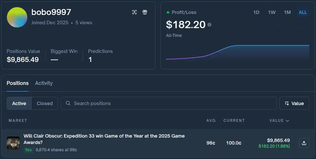 正当大家忧心忡忡之时,一个神秘人士在一个看似和游戏圈毫无瓜葛的「预测市场」平台注册了账户,并充值了一万美元。他找到平台里「光与影是否会获得2025年GOTY」的话题,并将刚刚充值的一万美元全部押注在「是」。