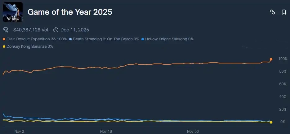 早在10月30日,距离颁奖典礼还有一个半月时,预测市场Polymarket就上线了「2025年度最佳游戏」的话题。《光与影》的获奖概率从一开始就死死钉在80%以上,而其他备受期待的3A大作获奖的概率均被压制在10%以下。由于这种一边倒的局面通常只出现在结果已经没有悬念的事件中,所以这种反常让许多交易员嗅到了一丝不同寻常的气息:这不仅仅是看好,这是确信。