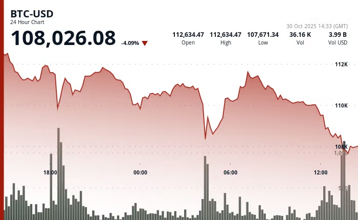 比特币(BTC)跌破周三的低点,跌破10.8万美元,创一周多以来的最低价格。过去24小时内,比特币下跌了4.4%,较周一11.6万美元的高点下跌了近8%。
