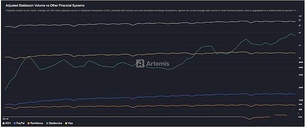 这种转变已在规模上显现。稳定币的市值在不到十年的时间里从几乎为零增长到约3000亿美元,如今其实际经济交易量甚至超过了PayPal和Visa等传统支付网络,即便不计入交易所内部转账和MEV交易。非银行、非银行卡支付渠道首次实现了真正的全球规模运营。