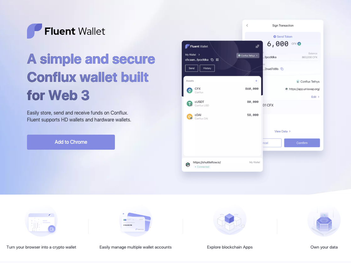 Fluent Wallet 是专为 Conflux 网络打造的 Web3 钱包,用户可通过它管理资产并与 DApp 交互。