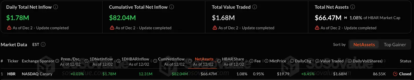 SOL的首批产品于10月28日上市,尽管上市以来SOL价格持续下跌约31%,但资金却呈现出越跌越买的逆势流入态势。截至12月2日,整个SOL ETF板块累计净流入高达6.18亿美元,总资产达到9.15亿美元占SOL总市值的1.15%。在不到两个月的时间里取得如此规模,也在一定程度上反映出市场对 SOL 作为“第三大公链”定位的广泛认可。
