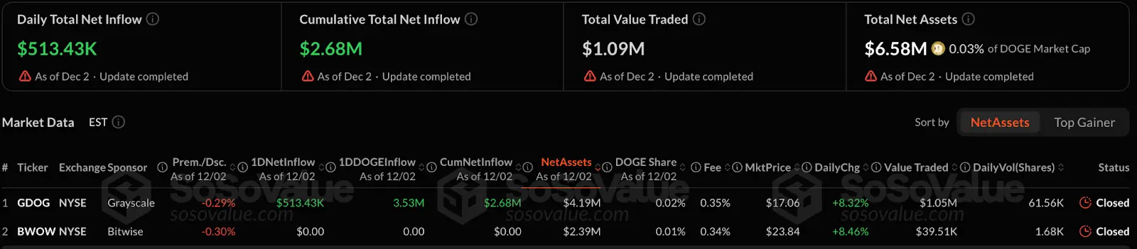 DOGE ETF遭遇了市场的彻底冷遇,印证了Meme币与机构资金渠道之间存在巨大鸿沟。以Grayscale的GDOG(11月24日上市)为代表的产品表现极为惨淡,累计净流入仅268万美元,资产管理规模不足700万美元,仅占Doge总市值的0.03%。更严峻的是Bitwise的同类产品甚至出现了零流入,且低迷的日成交额(约109万美元)也表明传统投资者目前对Doge这类缺乏基本面支撑、主要依赖社区情绪的MEME资产依然存在怀疑态度。