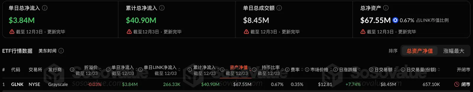 灰度的GLINK ETF于12月3日正式上线,上线后首日便流入了近4090万美元,目前总资产价值约6755万美元,占Link总市值的0.67%。从首日交易结果来看,GLINK在流动性和资金吸引力方面均取得了良好开局。