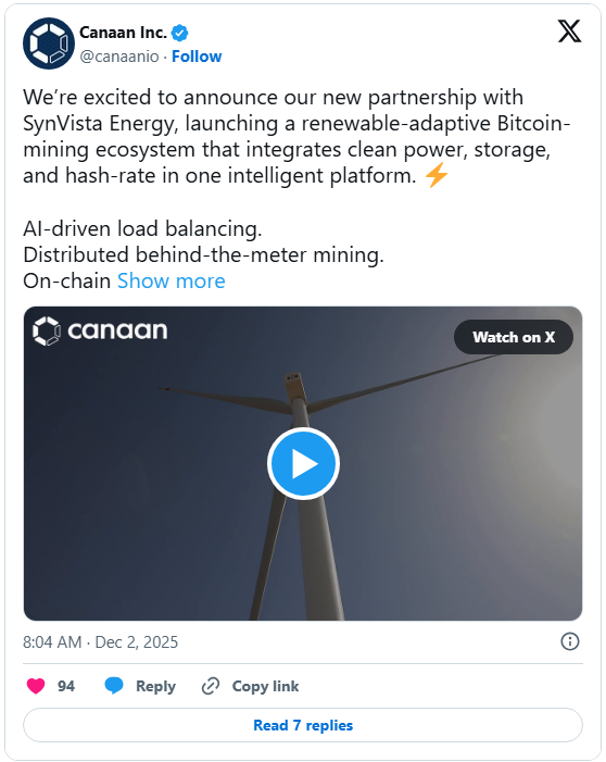 周一,Canaan宣布,将与绿色能源开发商SynVista Energy合作,打造一款使用人工智能驱动的调度引擎的挖矿设备,以将能源供应与动态哈希率需求同步。
