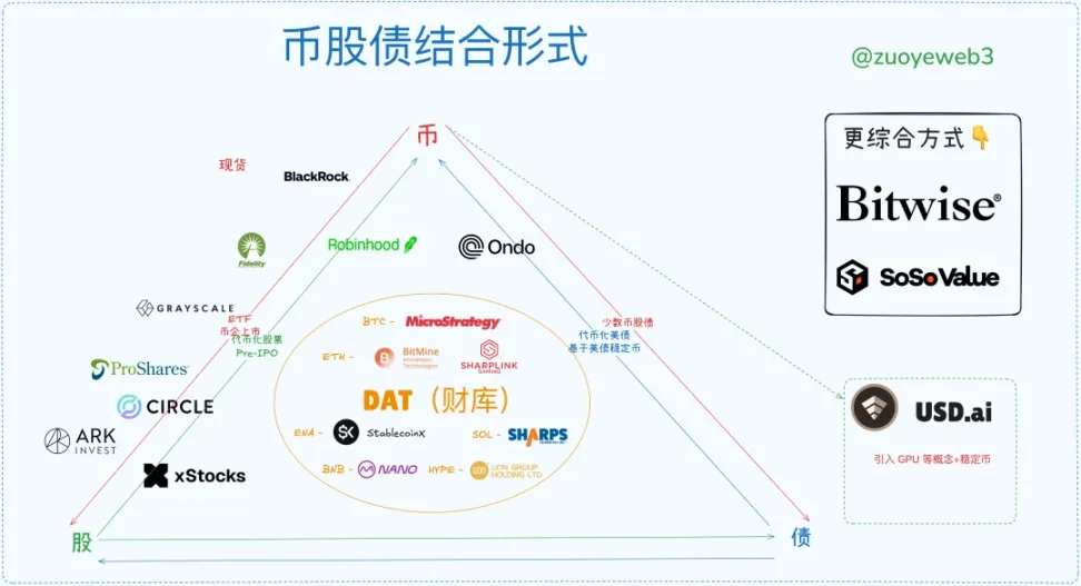 重在考察币股债之间的结构关系,以及会创造出什么新品种和新方向,ETF 已经固化,DAT 还在厮杀,稳定币大规模扩展,链上和链下机会最大,币股和 Pre IPO 潜力无限,但是很难通过兼容方式改造传统金融,没有搭建出自身的内循环体系。
