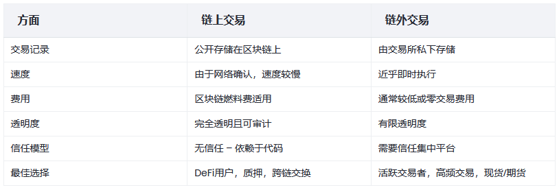 无论你是在深入研究去中心化金融协议,还是在中心化交易所交易山寨币,理解链上和链下加密货币交易之间的区别都是至关重要的。每种方法都有其在速度、成本、安全性和控制方面的权衡。
