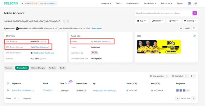 下图 Solscan 展示了 MEME 代币 SBAE 的情况,其中 SOL Balance 0.002039 就是租金。