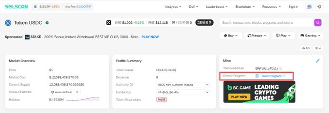 USDC 页面,尽管未显示 SOL Balance,但 Owner Program 是 Token Program,意味着仍需要缴纳租金。