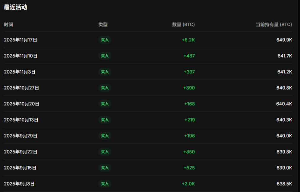 ● 作为比特币最大持有者之一的MicroStrategy(已更名为Strategy)依旧坚持其比特币积累策略。11月10日至16日期间,该公司执行了8.356亿美元的BTC购买,以平均价格102,171美元购入8,178枚比特币。