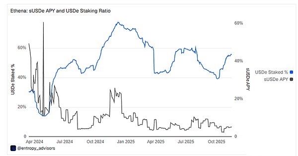 即便Ethena在今年Q3创下了1.51亿美元费用捕获的最高纪录,但事实上还是无法抵挡由于收益率大幅下跌导致的市场信心缺失。目前USDe的收益率虽然已经回升到5%以上,但总体的供应量和交易量都处于下滑状态。
