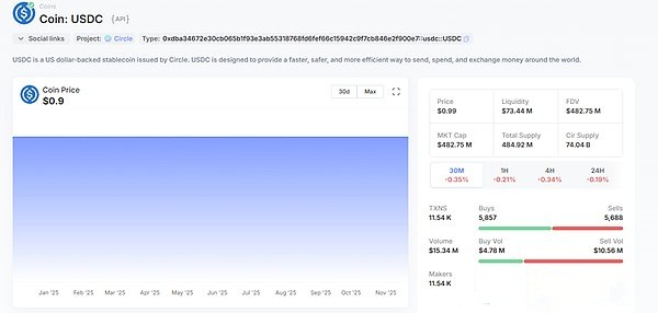 在这场市值缩水的浪潮中,USDC成为了最大的“失血点”。数据显示,在流出的近60亿美元中,USDC占据了半壁江山,其总市值从763亿美元滑落至735亿美元,下降达28亿美元。