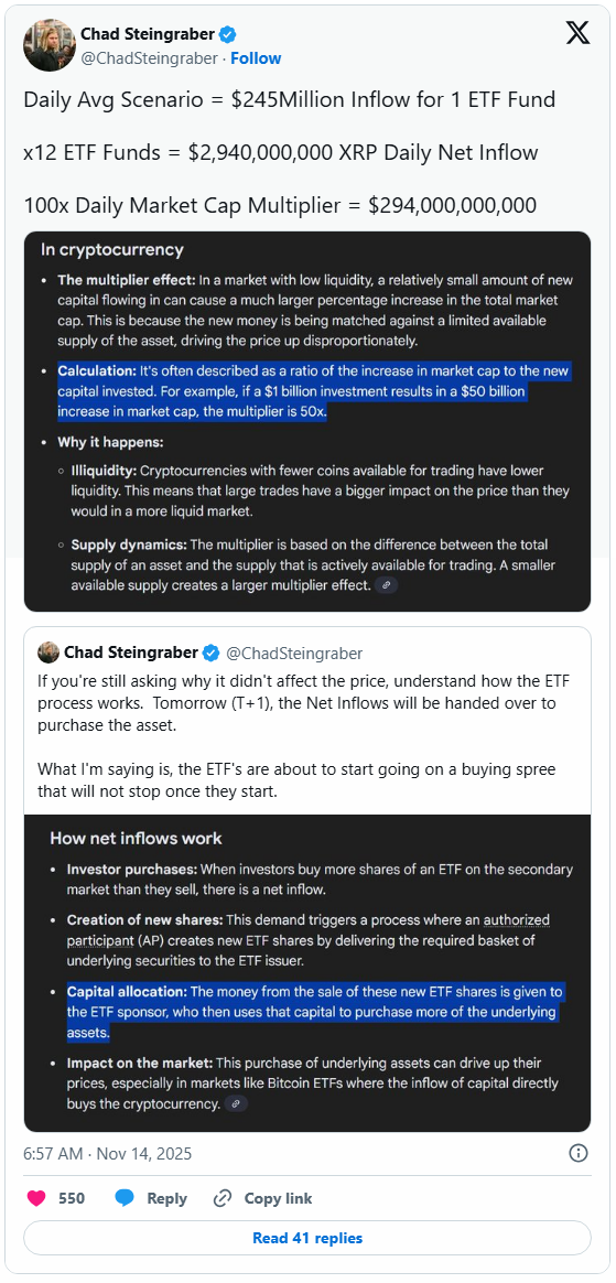 这位市场评论员随后试图估算这种模式如何扩展到整个ETF产品线。他以XRPC首日2.45亿美元的资金流入量为基准,指出如果所有12只XRP ETF的资金流入量均为2.45亿美元,那么每日净流入总额将达到29.4亿美元。