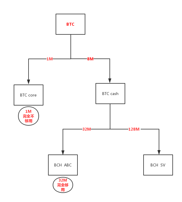 中本聪设计的比特币原本对于区块大小没有限制,因为最初链上交易数很少,出于安全考虑便采用1M区块。随着比特币越来越普及,链上交易数剧增,1M区块的限制严重影响了比特币的出块速度,这导致交易时间变慢以及手续费增多,制约了比特币作为“点对点的电子现金系统”的发展,对此,关于是否扩容比特币社区进行了长达两年的争论。扩容派认为不应该锁死比特币1M区块的限制,而应随需求进行调整;不扩容派认为应该锁死1M区块的限制,对于交易时间和手续费可以通过发展闪电网络的方式解决。最后,双方无法达成妥协,以比特现金的诞生结束了这次扩容之争。
