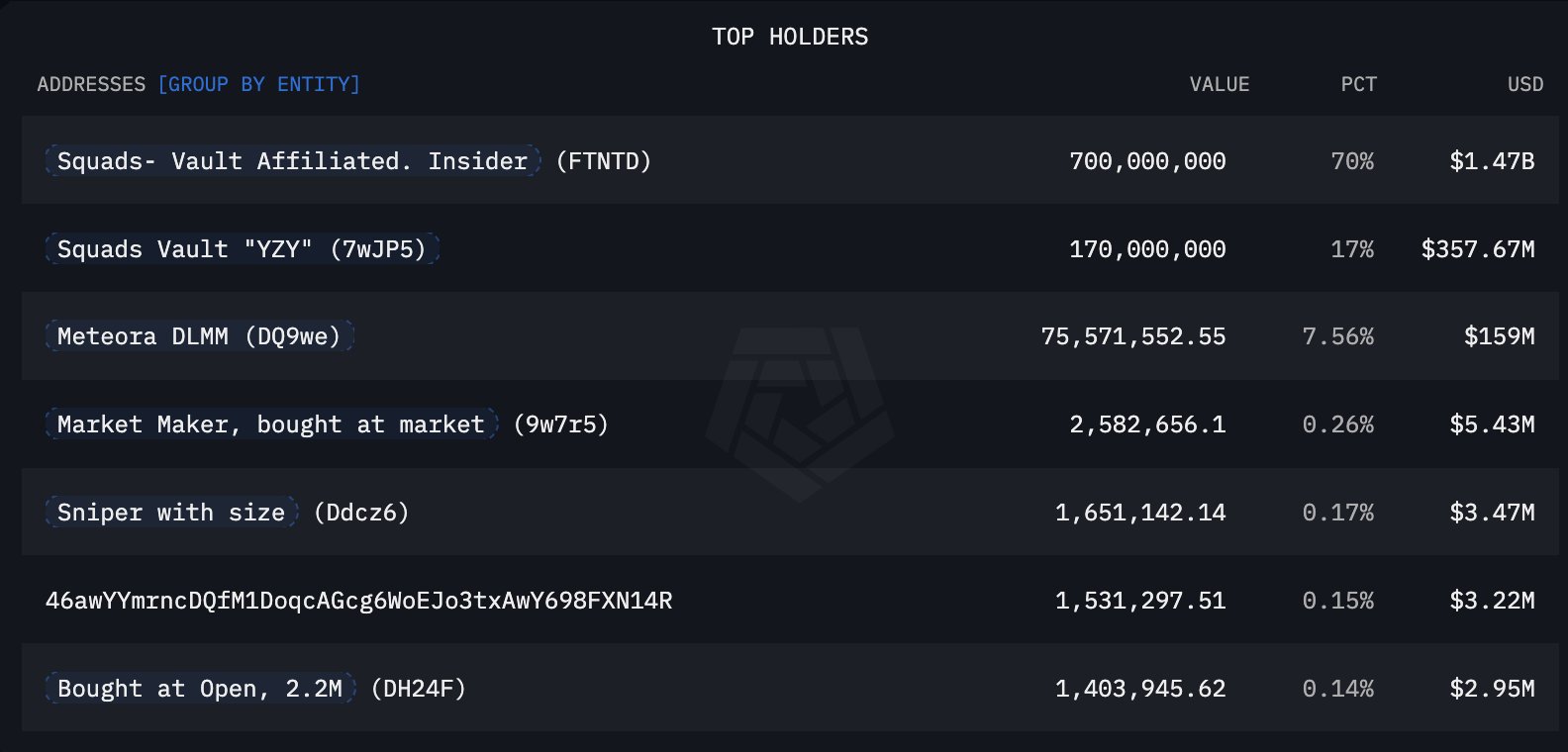 链上数据显示,YZY流通极度集中,约94%的代币在公开交易前已被内部人掌握,其中单一多签钱包就控制87%。这种分布,加上合约条款允许随时抽走流动性,令外界质疑市场被操纵。