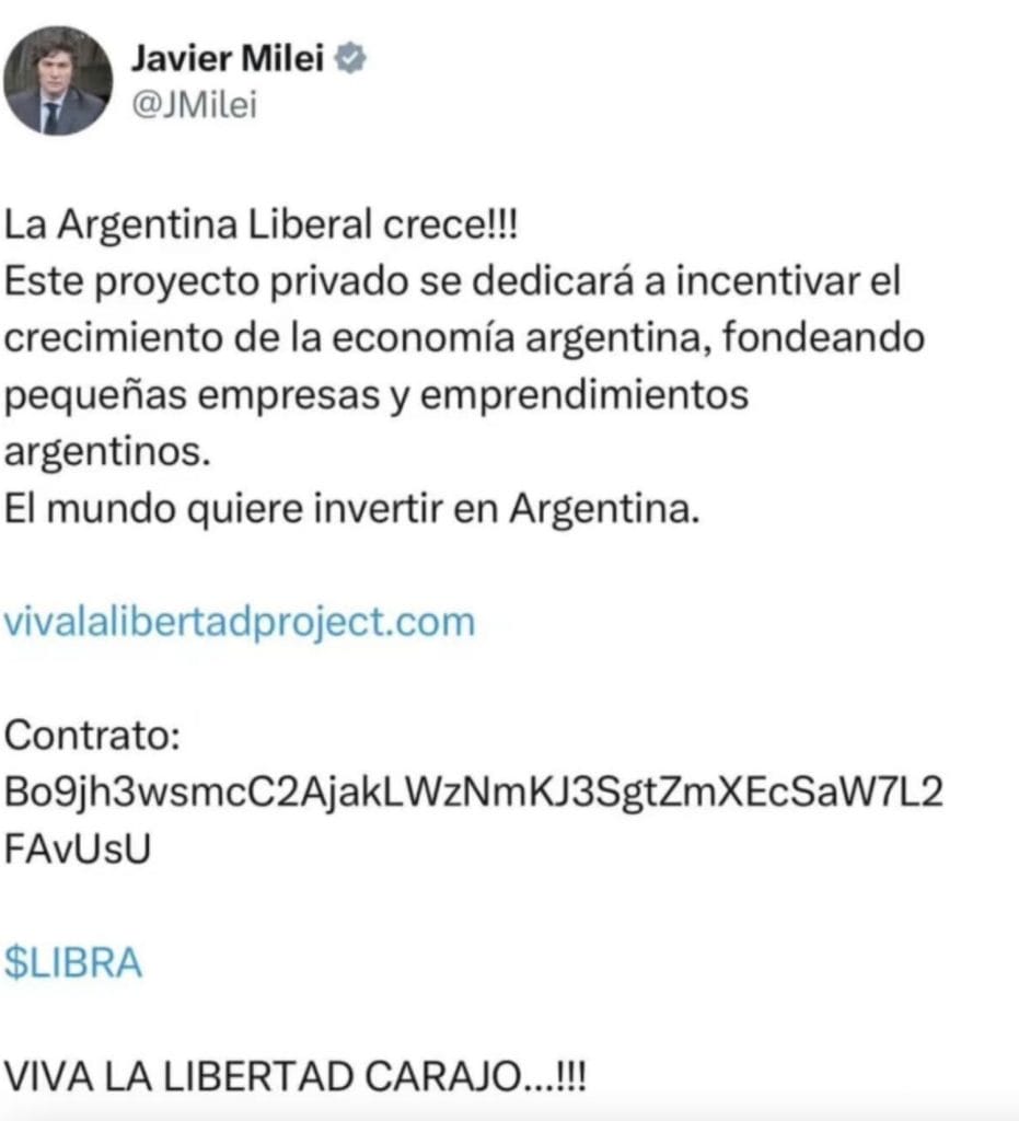 风波始于2月15日,当天米莱在社交平台X高调推荐迷因币LIBRA,声称该项目能为阿根廷的小型企业和初创公司提供资金,推动经济复苏,甚至直接附上官方网站和智能合约地址,相当于亲自为LIBRA站台。消息一出,LIBRA市值一度飙升至40亿美元。