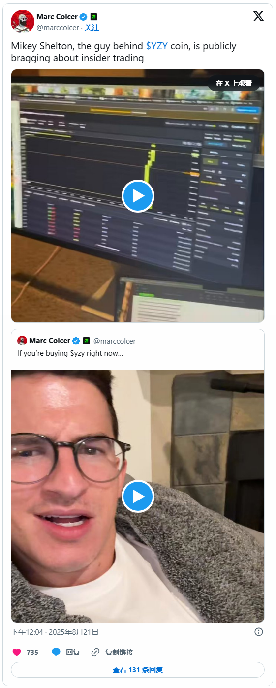 YZY迷因币投资者抱怨遭到“收割”,项目方核心人物Mikey Shelton更被怀疑在社交媒体上透露内部交易细节,消息曝光后迅速删除账号,让争议升级。