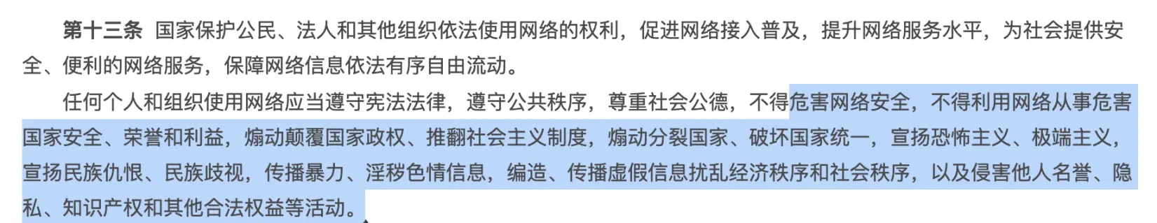 这里需要讨论的关键问题,不是是否使用了VPN,任何人都没有权力说只要使用了VPN就违法。问题的关键在于使用VPN后做了什么。假如是去用谷歌搜索学术论文、使用ins去追星等等,懂法的警察叔叔肯定不会说你违法;但是假如使用VPN去进行以下行为,那就另当别论了(摘自《网络安全法》)。