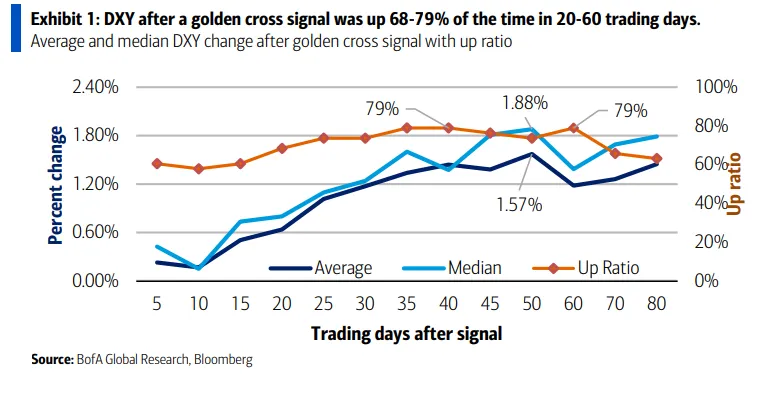 ● 历史统计意义:根据美银美林技术策略团队的统计,自1970年以来,这是美元指数第39次出现“黄金交叉”信号。