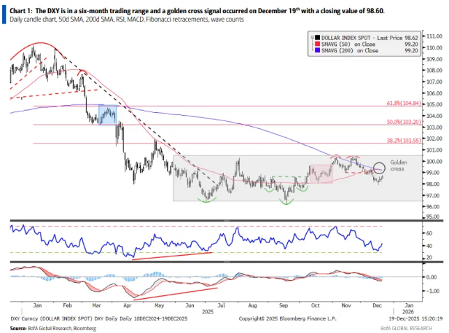 美元指数在2025年12月19日收盘后,其技术图表上触发了市场密切关注的技术信号:50日移动平均线上穿200日移动平均线,形成了被称为“黄金交叉”(Golden Cross)的看涨形态。