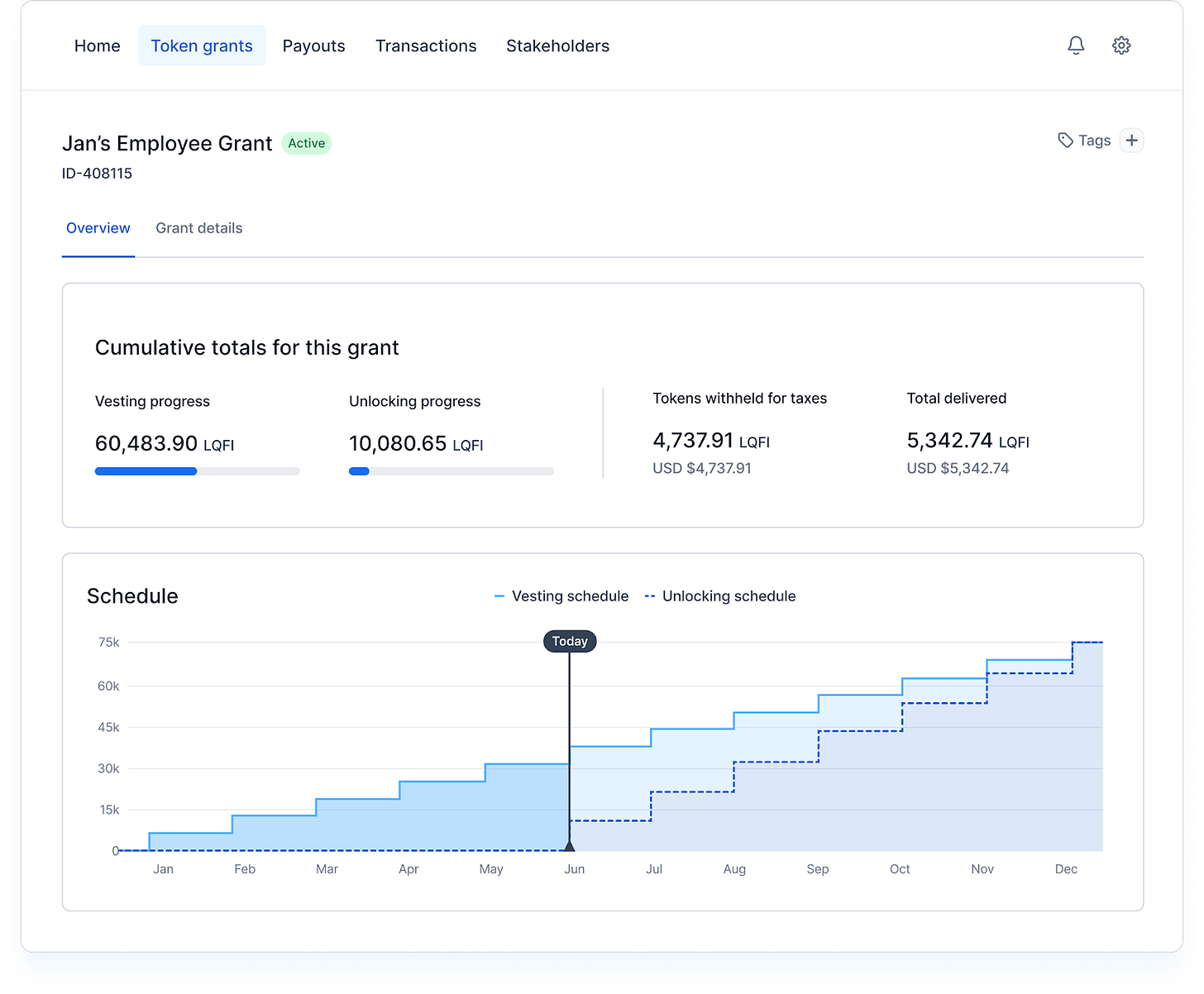 在发行代币时,Liquifi 提供工具来管理智能合约的归属和锁定计划。传统上,修改这些参数需要直接编辑智能合约,当管理成百上千个接收者时,这个过程会变得异常复杂。每次调整都需要额外的开发人员时间,并且存在人为错误的风险。Liquifi 通过允许在不修改合约代码的情况下修改分配条款来消除这种繁琐的操作,计算和分配过程都会自动完成。