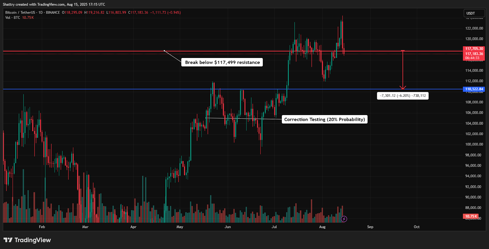 跌破114,797美元支撑位可能触发卖压,向119,975美元至110,000美元的主要支撑位回落,代表6-7%的下行空间,随后可能加速恢复。