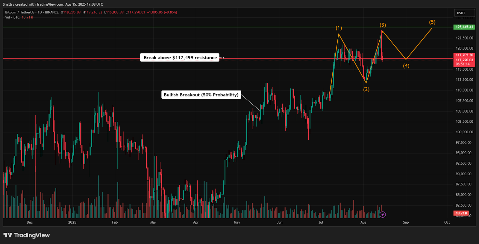 成功突破117,499美元阻力位,结合持续的机构采用,可能推动比特币达到119,000美元至125,000美元,较当前水平上涨2-7%。