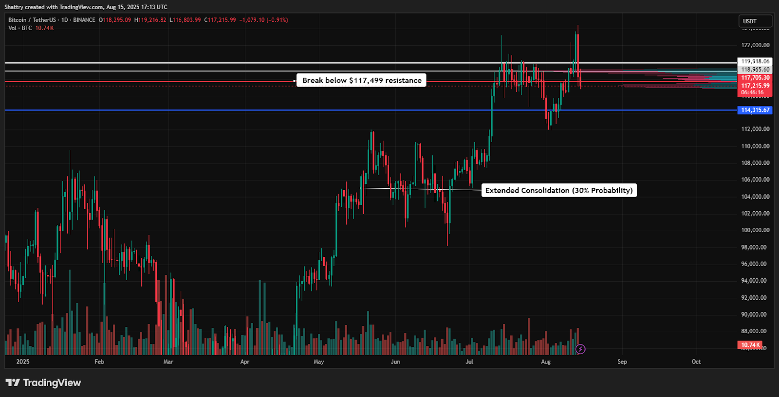 关键阻力出现在20日EMA约117,499美元,这是看涨延续的主要障碍。
