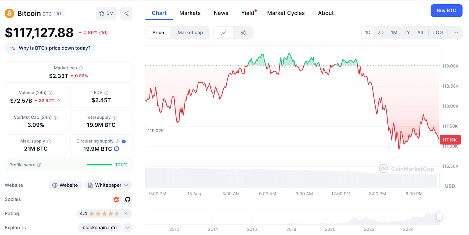 从技术面来看,比特币依旧维持在多个关键均线之上:50 日均线在 114,797 美元,100 日均线在 109,975 美元,200 日均线在 102,522 美元,整体走势保持偏向多头。然而,它同时也在挑战 20 日均线 117,499 美元的阻力位,这意味着行情可能随时迎来新的突破,或者会出现更深一步的回调调整。