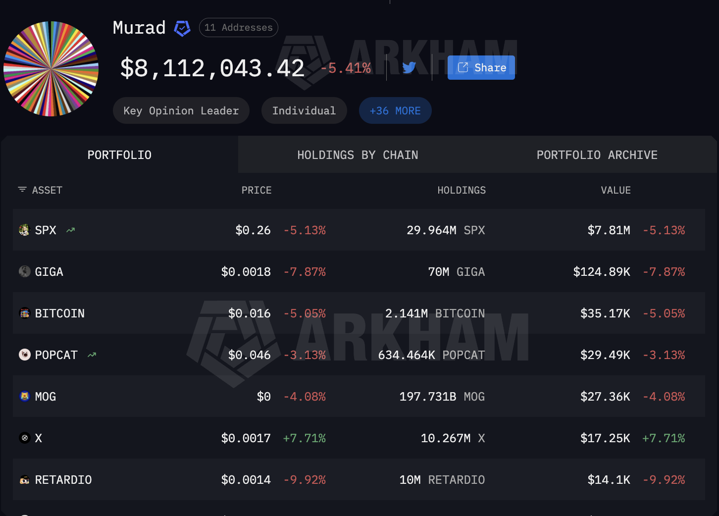 根据Arkham Intelligence以“Muststopmurad”实体追踪的马哈茂多夫公开标记钱包,目前持有约2996.4万枚SPX,价值约779万美元。这一单项持仓约占其追踪投资组合总额的96%,该组合目前估值约810万美元。