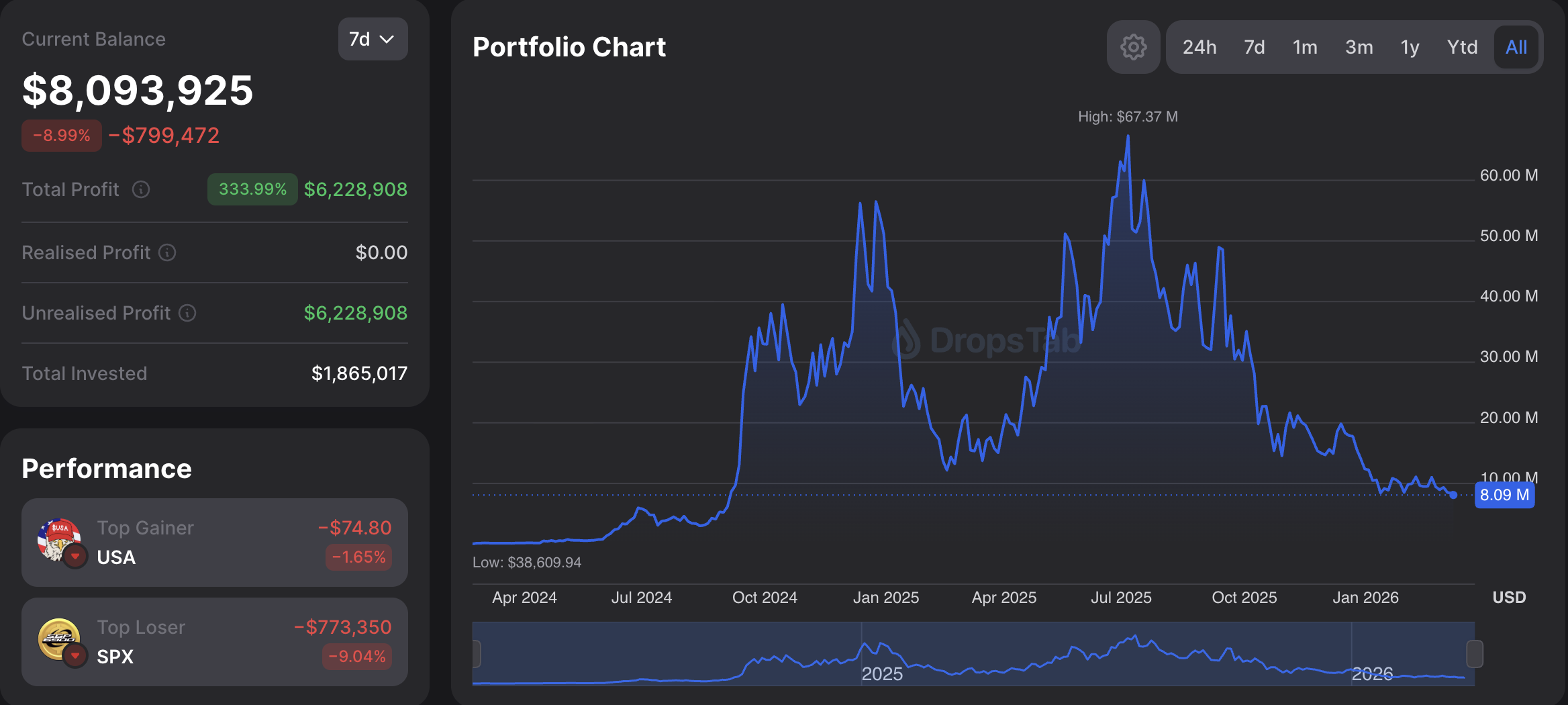 去年七月峰值时期,该投资组合价值约为6700万美元。此后随着包括SPX在内的整体迷因币板块从高点回调超过80%,马哈茂多夫承受了约6000万美元的未实现亏损。