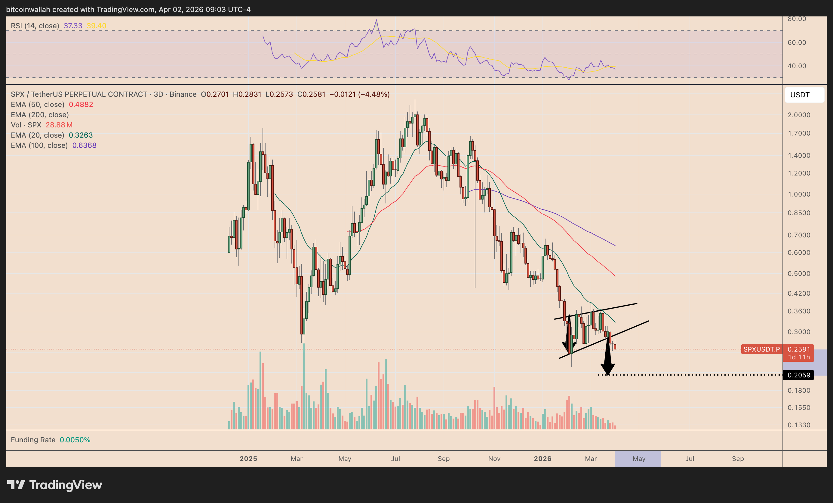 从三日线图观察,SPX6900似乎正在跌破上升楔形——这是一种看跌形态,通常价格跌破支撑线后会继续下探。SPX已在0.26美元附近失守楔形下轨趋势线,且持续位于20日、50日及100日指数移动平均线下方,凸显动能疲软。若跌破形态得到确认,测算目标价位指向0.205美元,较当前水平低约20%。若SPX下跌20%,马哈茂多夫的迷因币投资组合将再缩水约156万美元。